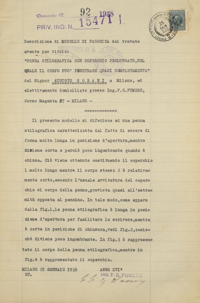 Privativa industriale per un modello di fabbrica. Testo descrittivo della registrazione: "Penna stilografica con coperchio prolungato, nel quale il corpo può penetrare quasi completamente".