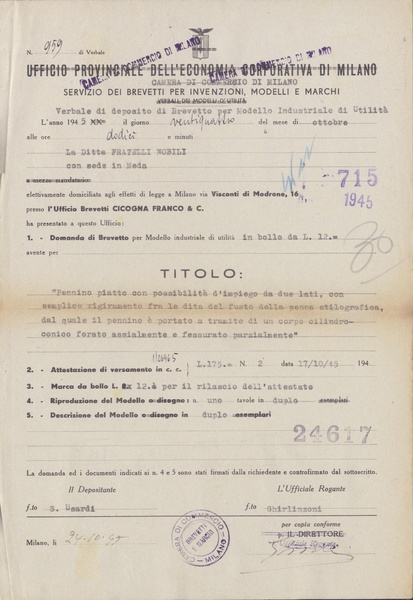 Privativa industriale per un modello di utilità. Testo descrittivo della registrazione: "Pennino piatto con possibilità d'impiego da due lati, con semplice rigiramento fra le dita del fusto della penna stilografica, dal quale il pennino é portato a tramite di un corpo cilindro-conico forato assialmente e fessurato parzialmente".