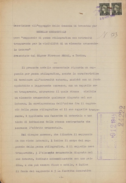 Privativa industriale per un modello di fabbrica. Testo descrittivo della registrazione: "Cappuccio di penna stilografica con estremità semisferica cava trasparente per la visibilità di un elemento ornamentale interno".