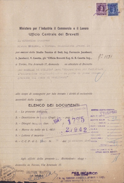 Privativa industriale per un modello di utilità. Testo descrittivo della registrazione: "Dispositivo per facilitare l'aspirazione dell'inchiostro da parte di penna stilografica del fondo di recipienti".