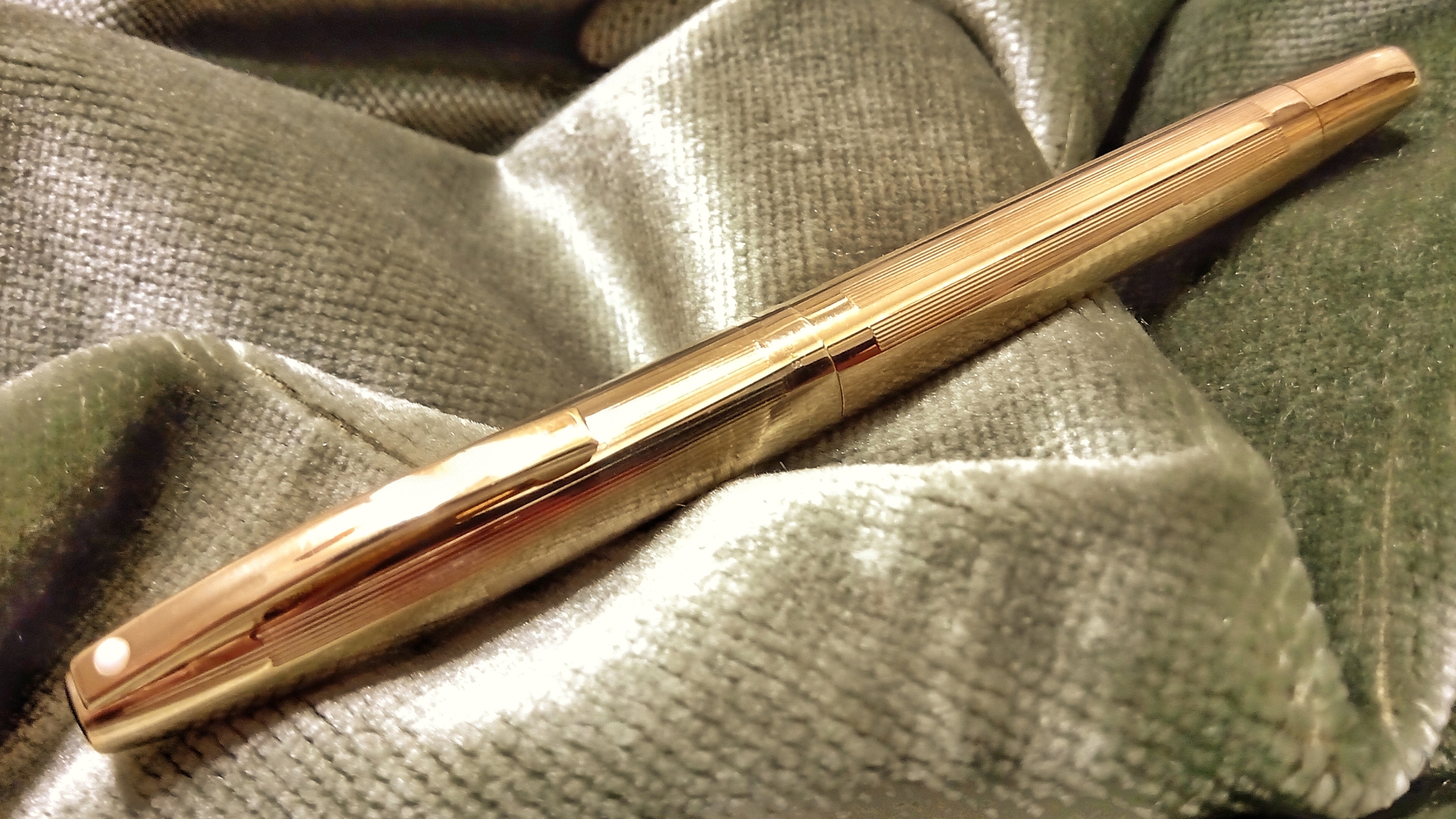 Photo of a pen produced by Sheaffer. Model: Sheaffer Imperial. Filling system: Touch Down. In lined pattern gold rolled metal. Imperial Triumph version (AS17T), with hooded feed and shorter smooth band.