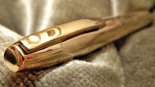Foto di una penna Sheaffer. Modello: Sheaffer Imperial. Caricamento "Touch Down". Realizzazione in metallo laminato in oro con motivo righe. Versione Imperial Triumph (AS17T), con alimentatore schermato e banda liscia più corta. Contributo di Gustavo, (utente forum gfrico2000).