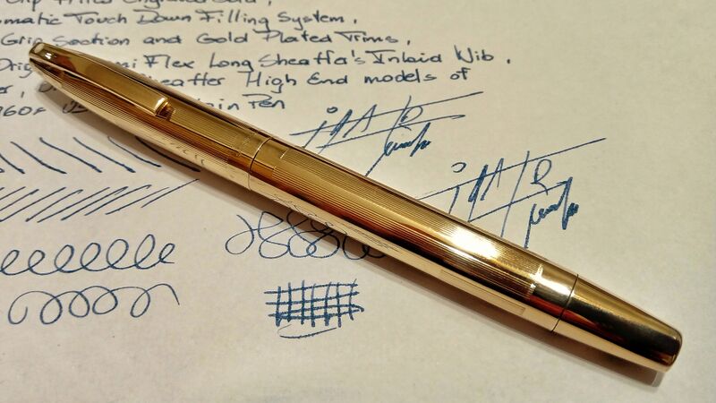 Foto di una penna Sheaffer. Modello: Sheaffer Imperial. Caricamento "Touch Down". Realizzazione in metallo laminato in oro con motivo righe. Versione Imperial Triumph (AS17T), con alimentatore schermato e banda liscia più corta. Contributo di Gustavo, (utente forum gfrico2000).