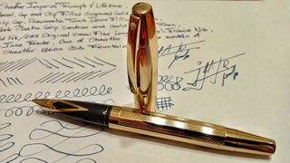 Foto di una penna Sheaffer. Modello: Sheaffer Imperial. Caricamento "Touch Down". Realizzazione in metallo laminato in oro con motivo righe. Versione Imperial Triumph (AS17T), con alimentatore schermato e banda liscia più corta. Contributo di Gustavo, (utente forum gfrico2000).