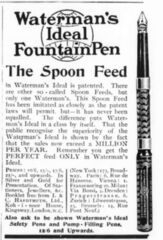 Scansione di una pubblicità Waterman datata 1911-03-25. Pubblicazione su: The Illustrated London News, vol. CXXXVIII, n. 3753, pag. 447. Rappresentante: "L. & C. Hardtmuth.". Indica come indirizzo: "Koh-i-noor House, Kingsway, London". Data dal reperimento della pagina su una versione archiviata della rivista. Pubblicità generica, mostra dei modelli 1x, cita le versioni Pump-Filling e "Ideal Safety Pen" e lo Spoon-Feed.