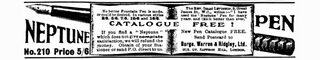 Scanning of advertising from Neptune dated 1911. Published on: The Strand Magazine - An Illustrated Monthly, vol. XLI (Jan-Jun), pag. 53. Refers to the company as: "Burge, Warren & Ridgley Ltd.". Mention as address: "91/2, Great Saffron Hill, London". Dating established by finding the page in an archived version of the magazine. First half of the year. Advertising for fountain pens, showing one called "Neptune 210".