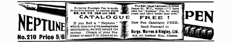 Scansione di una pubblicità Neptune datata 1911. Pubblicazione su: The Strand Magazine - An Illustrated Monthly, vol. XLI (Jan-Jun), pag. 53. Riferimento all'azienda come: "Burge, Warren & Ridgley Ltd.". Indica come indirizzo: "91/2, Great Saffron Hill, London". Data dal reperimento della pagina su una versione archiviata della rivista. Prima metà dell'anno. Pubblicità per delle stilografiche, ne mostra una chiamata "Neptune 210".
