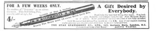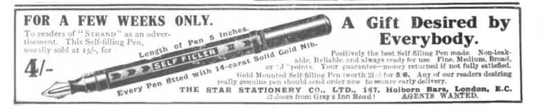 Scanning of advertising from The Star Stationery dated 1911. Published on: The Strand Magazine - An Illustrated Monthly, vol. XLII (Jul-Dec), pag. 70. Refers to the company as: "The Star Stationery, Co., Ltd.". Mention as address: "147, Holborn Bars, London, E.C.". Dating established by finding the page in an archived version of the magazine. Second half of the year. Advertising for a model marked "Self Filler" with automatic filling (not identified), with gold nib (with medium, broad e J points).