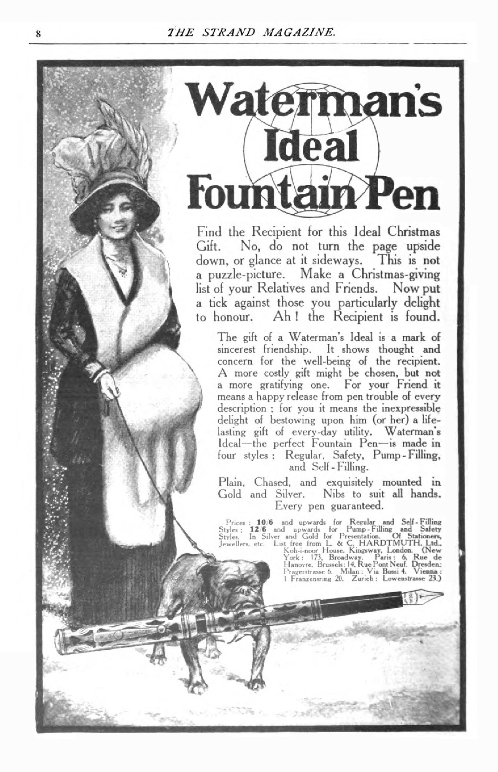 Scanning of advertising from Waterman dated 1911. Published on: The Strand Magazine - An Illustrated Monthly, vol. XLII (Jul-Dec), pag. 8. Agent: "L. & C. Hardtmuth.". Mention as address: "Koh-i-noor House, Kingsway, London". Dating established by finding the page in an archived version of the magazine. Second half of the year. Generic advertising, showing a 51x model.