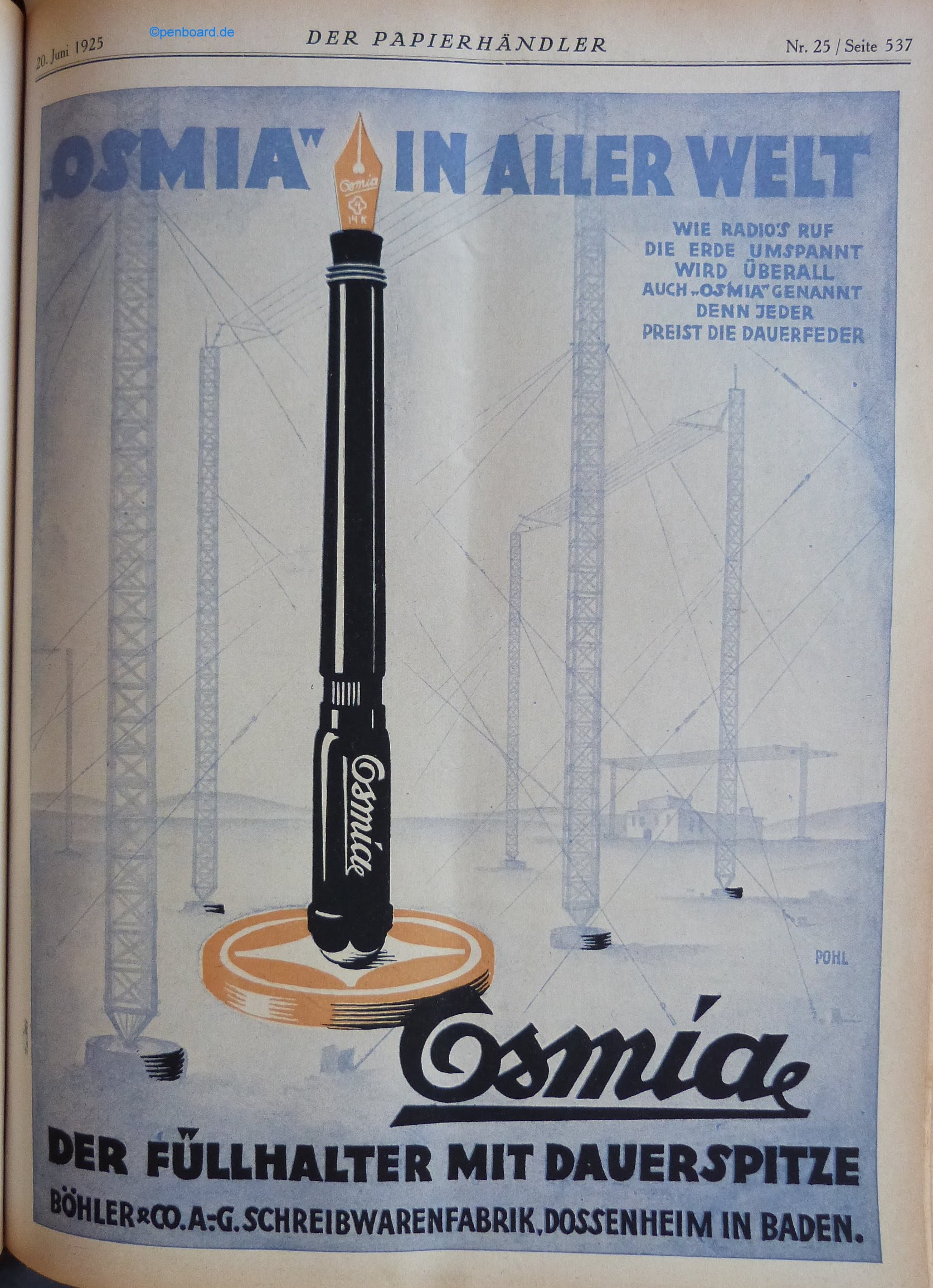 Scansione di una pubblicità Osmia datata 19225-06-20. Pubblicazione su: Der Papierhändler - Fachblatt Schreibwaren für Papier u. Büro-Bedarf, n. 25, pag. 537. Contributo di Tom Westerich, https://www.penboard.de. Data visibile direttamente. Pubblicità della Osmia (ancora col nome "Böhler & Co. Screibwarenfabrik", Dossenheim in Baden) per una rientrante.