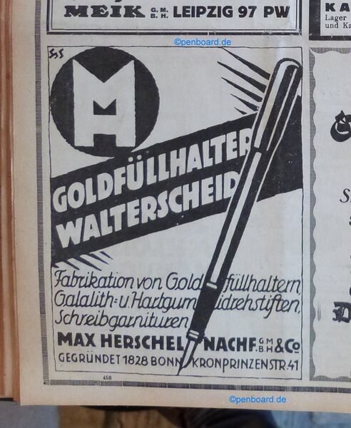 Scansione di una pubblicità datata 1925. Pubblicazione su: Der Papierhändler - Fachblatt Schreibwaren für Papier u. Büro-Bedarf. Contributo di Tom Westerich, https://www.penboard.de. Data ottenuta da quella di pubblicazione del volume da cui la pagina è estratta. Pubblicità di una stilografica Walterscheid della "Max Herschel Nachf & Co. G.m.b.H.".