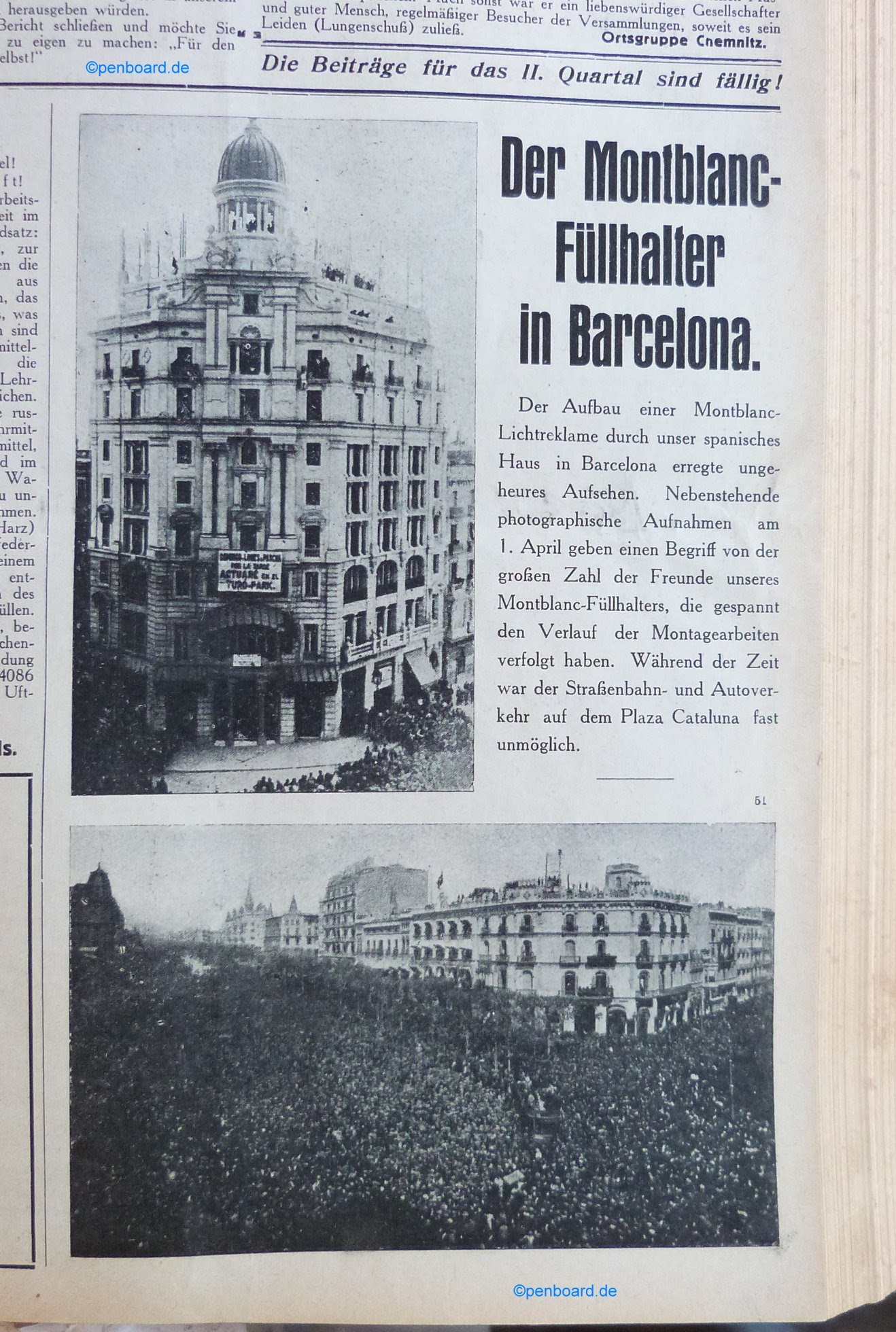 Scansione di una pubblicità Montblanc datata 1925. Pubblicazione su: Der Papierhändler - Fachblatt Schreibwaren für Papier u. Büro-Bedarf. Contributo di Tom Westerich, https://www.penboard.de. Data ottenuta da quella di pubblicazione del volume da cui la pagina è estratta. Pubblicità della Montblanc su una filiale a Barcellona.