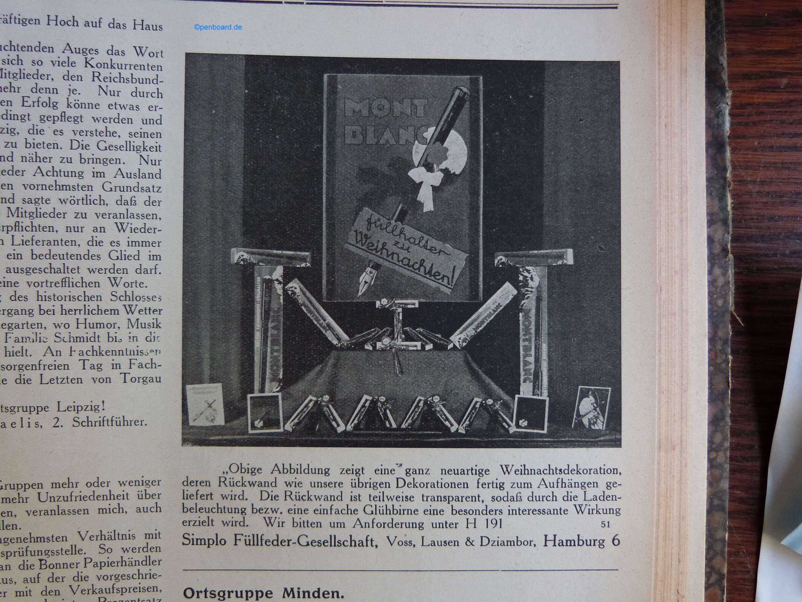 Scansione di una pubblicità Montblanc datata 1925. Pubblicazione su: Der Papierhändler - Fachblatt Schreibwaren für Papier u. Büro-Bedarf. Contributo di Tom Westerich, https://www.penboard.de. Data ottenuta da quella di pubblicazione del volume da cui la pagina è estratta. Una pubblicità Montblanc per il materiale pubblicitario gratuito messo a disposizione dei rivenditori, relativo all'allestimendo di una vetrina con le confezioni delle proprie rientranti. Cita la ditta come "Simplo Füllfeder-Gesellshchaft Voss, Lausen & Dziambor", Hamburg 6.