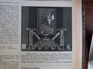 Scanning of advertising from Montblanc dated 1925. Published on: Der Papierhändler - Fachblatt Schreibwaren für Papier u. Büro-Bedarf. Dating established by the publication date of the volume from which the page is taken. An advertisement Montblanc for free advertising materials made available to retailers, about the setting up of a showcase with the packaging of its safeties. Mention the company as "Simplo Fullfeder-Gesellschaft Voss, Lausen & Dziambor", Hamburg 6.