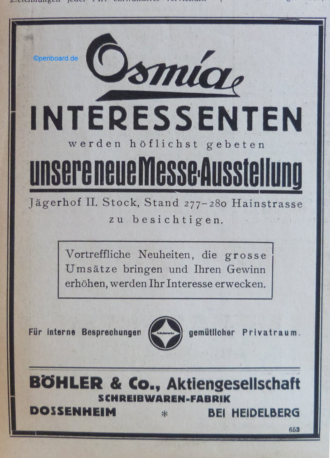 Scansione di una pubblicità Osmia datata 1925. Pubblicazione su: Der Papierhändler - Fachblatt Schreibwaren für Papier u. Büro-Bedarf. Contributo di Tom Westerich, https://www.penboard.de. Data ottenuta da quella di pubblicazione del volume da cui la pagina è estratta. Pubblicità della Osmia che invita i rivenditori presso la propria esposizione. Cita la ditta come "Böhler & Co. Aktiengesellschaft Screibwaren-fabrik", Dossenheim bei Heidelberg.