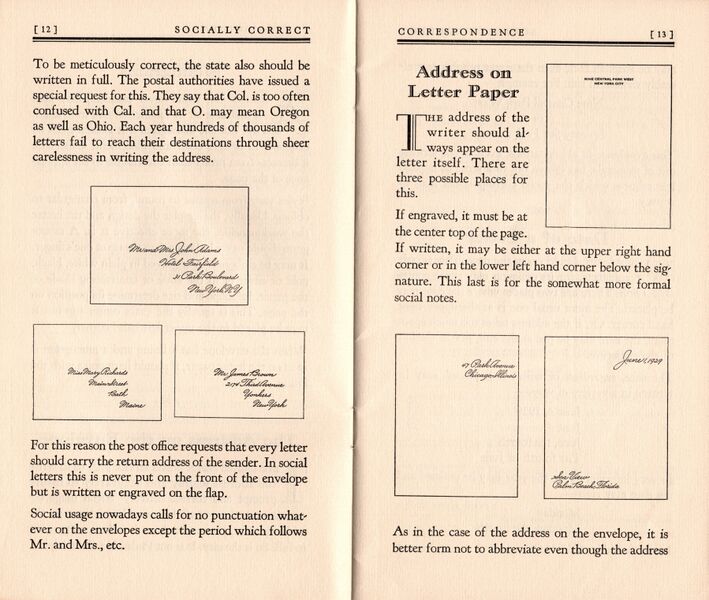 Scansione di un libretto Waterman datata 1929. Ritoccata dall'autore per una migliore nitidezza. Contributo di Giorgio (utente forum Musicus). Data riportata su un'altra pagina. Dodicesima e tredicesima pagina. Libretto sulla corretta forma da adottare nella "corrispondenza sociale" (sia lettere che biglietti), tanto privata quanto di lavoro, come codificata dall’uso e dalle convenzioni negli Stati Uniti del 1929.