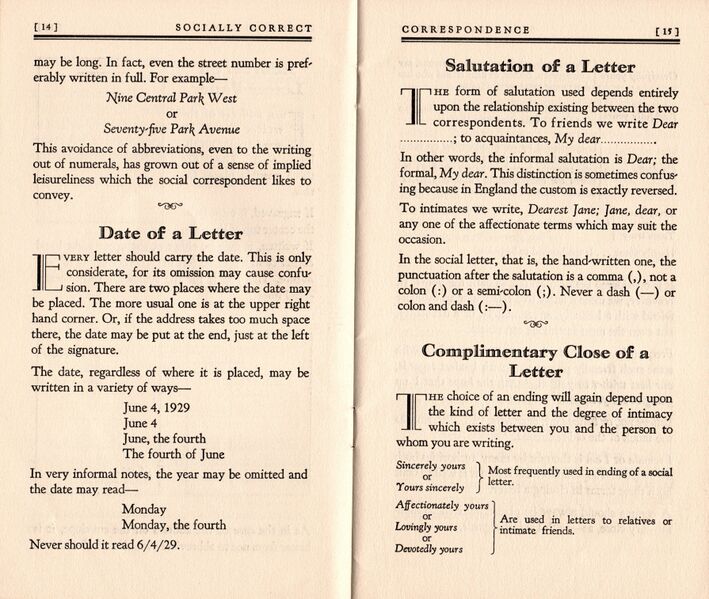 Scansione di un libretto Waterman datata 1929. Ritoccata dall'autore per una migliore nitidezza. Contributo di Giorgio (utente forum Musicus). Data riportata su un'altra pagina. Quattordicesima e quindicesima pagina. Libretto sulla corretta forma da adottare nella "corrispondenza sociale" (sia lettere che biglietti), tanto privata quanto di lavoro, come codificata dall’uso e dalle convenzioni negli Stati Uniti del 1929.