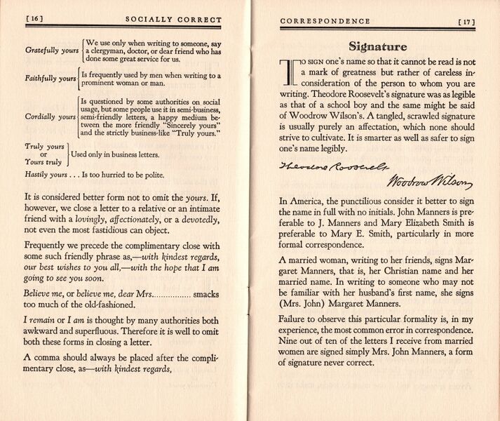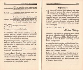 Scansione di un libretto Waterman datata 1929. Ritoccata dall'autore per una migliore nitidezza. Contributo di Giorgio (utente forum Musicus). Data riportata su un'altra pagina. Sedicesima e dicassettesima pagina. Libretto sulla corretta forma da adottare nella "corrispondenza sociale" (sia lettere che biglietti), tanto privata quanto di lavoro, come codificata dall’uso e dalle convenzioni negli Stati Uniti del 1929.