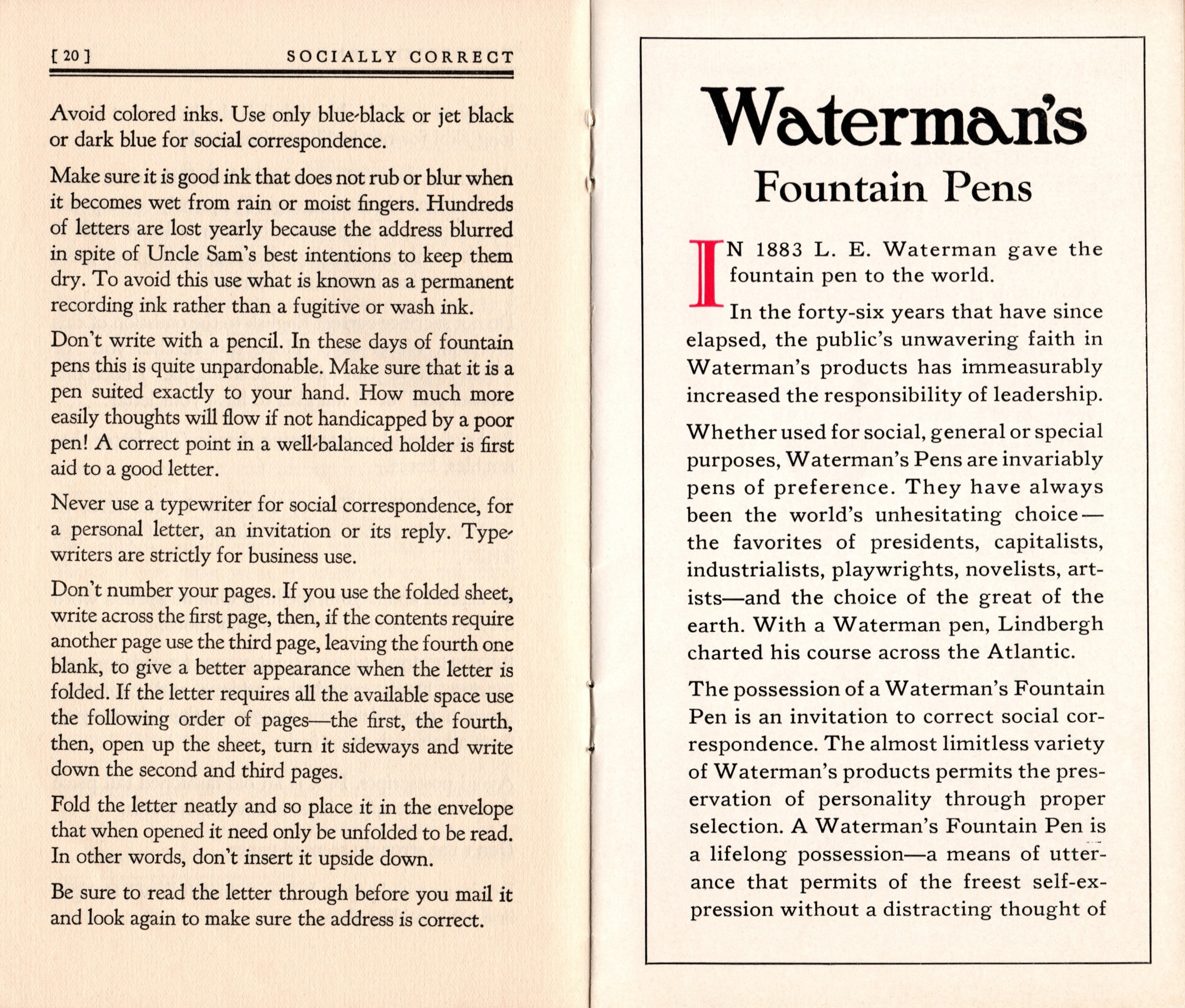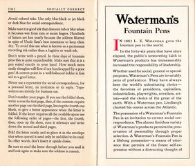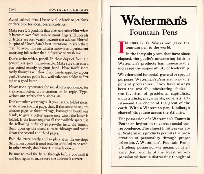 Scansione di un libretto Waterman datata 1929. Ritoccata dall'autore per una migliore nitidezza. Contributo di Giorgio (utente forum Musicus). Data riportata su un'altra pagina. Ventesima pagina di un libretto sulla corretta forma da adottare nella "corrispondenza sociale" (sia lettere che biglietti), tanto privata quanto di lavoro, come codificata dall’uso e dalle convenzioni negli Stati Uniti del 1929. A questa si affianca la prima pagina di un inserto pubblicitario sulle penne dell'azienda.