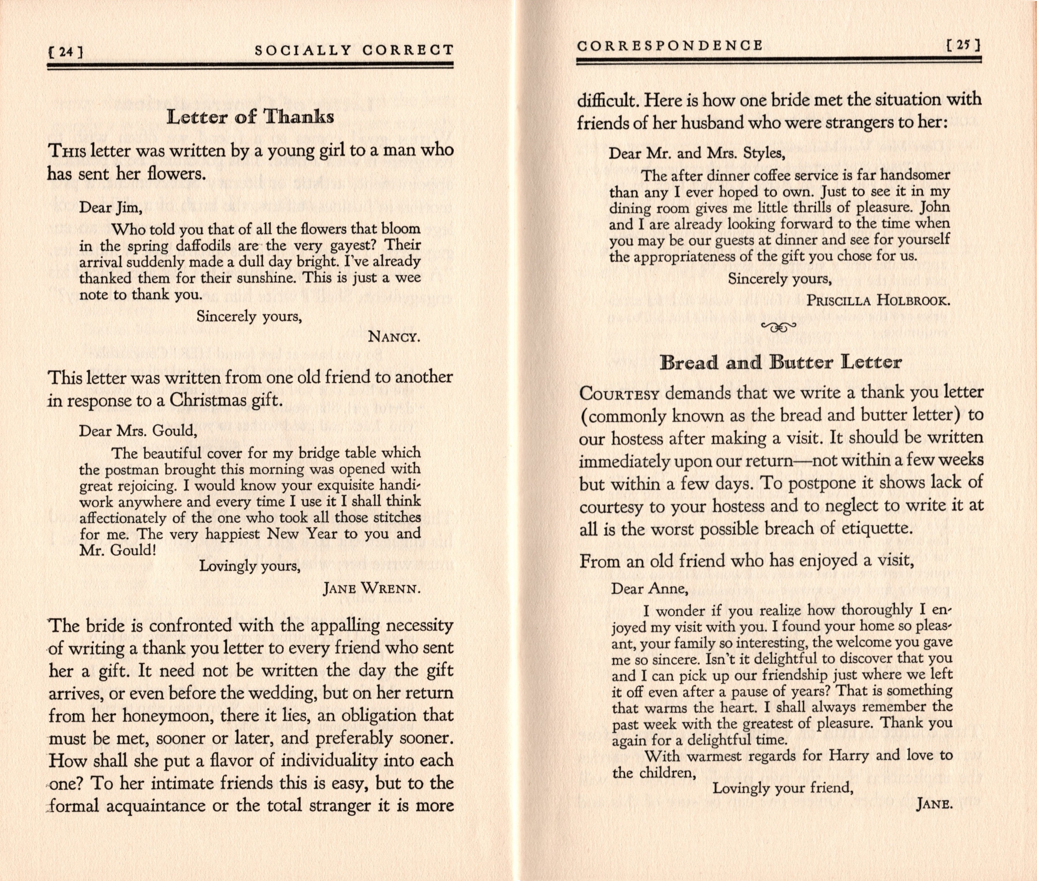 Scanning of a booklet from Waterman dated 1929. Retouched by the author for a better sharpness. Date reported on another page. Twenty-fourth and twenty-fifth page. Booklet on the proper form to take in “social correspondence” (both letters and cards), both private and business, as codified by custom and convention in the United States in 1929.