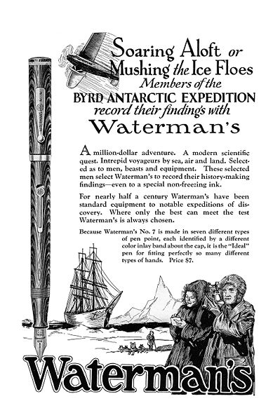 Scansione di una pubblicità Waterman datata 1929. Ritoccata dall'autore per una migliore nitidezza. Data da un riferimento sul retro del foglio, l'hanno compare nel riquadro di una pubblicità. Pubblicizza un modello Ripple No. 7.