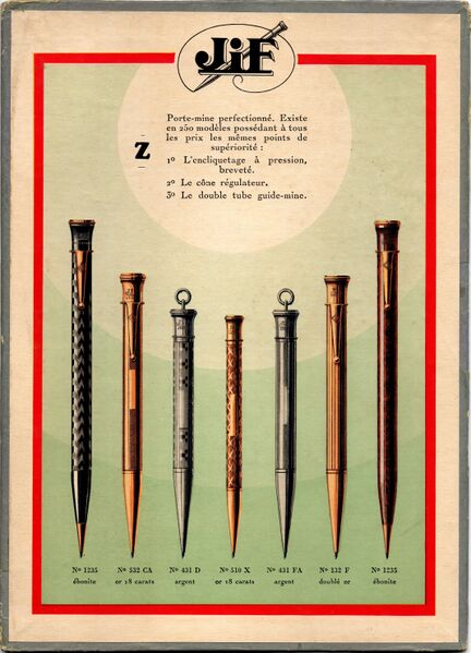 Scansione di una pubblicità JiF datata 1929. Ritoccata dall'autore per una migliore nitidezza. Contributo di Giorgio (utente forum Musicus). Data indicativa, da analoghe con questi modelli. Pubblicizza diverse matite meccaniche JiF alcune delle quali con rivestimenti usati anche sulle penne Waterman, ed in particolare sono mostrati: "Décor CA", "Décor D", "Décor X", "Décor FA", "Décor F".