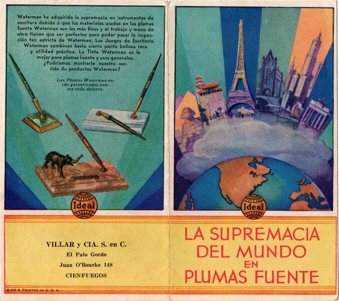 Scanning of a brochure from Waterman dated 1930. Retouched by the author for a better sharpness. Dating obtained by advertised objects, as detailed in the brochure presentation. Front section of the external side, with the first and last pages of the brochure, made with a double fold. The half corresponding to the last page advertises the company's desk pens. On the other side of File:1930-Waterman-Patrician-EtAl-Brochure-Int.jpg.