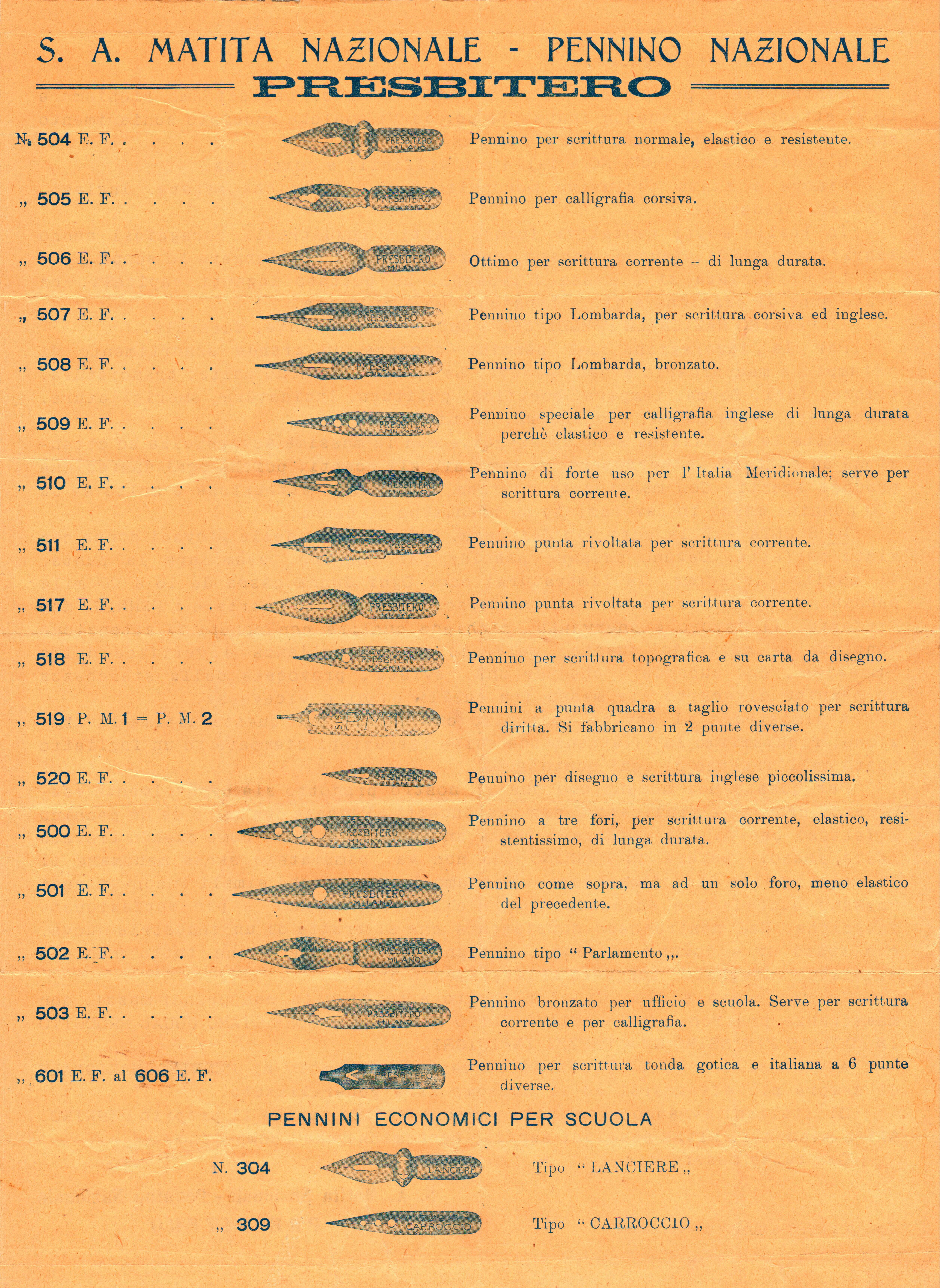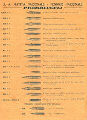 Scanning of advertising from Presbitero dated 1931. Retouched by the author for a better sharpness. Date reported on the back. List of various nibs types. On the other side of File:1931-Presbitero-Tabella-Pennini-Retro.jpg.