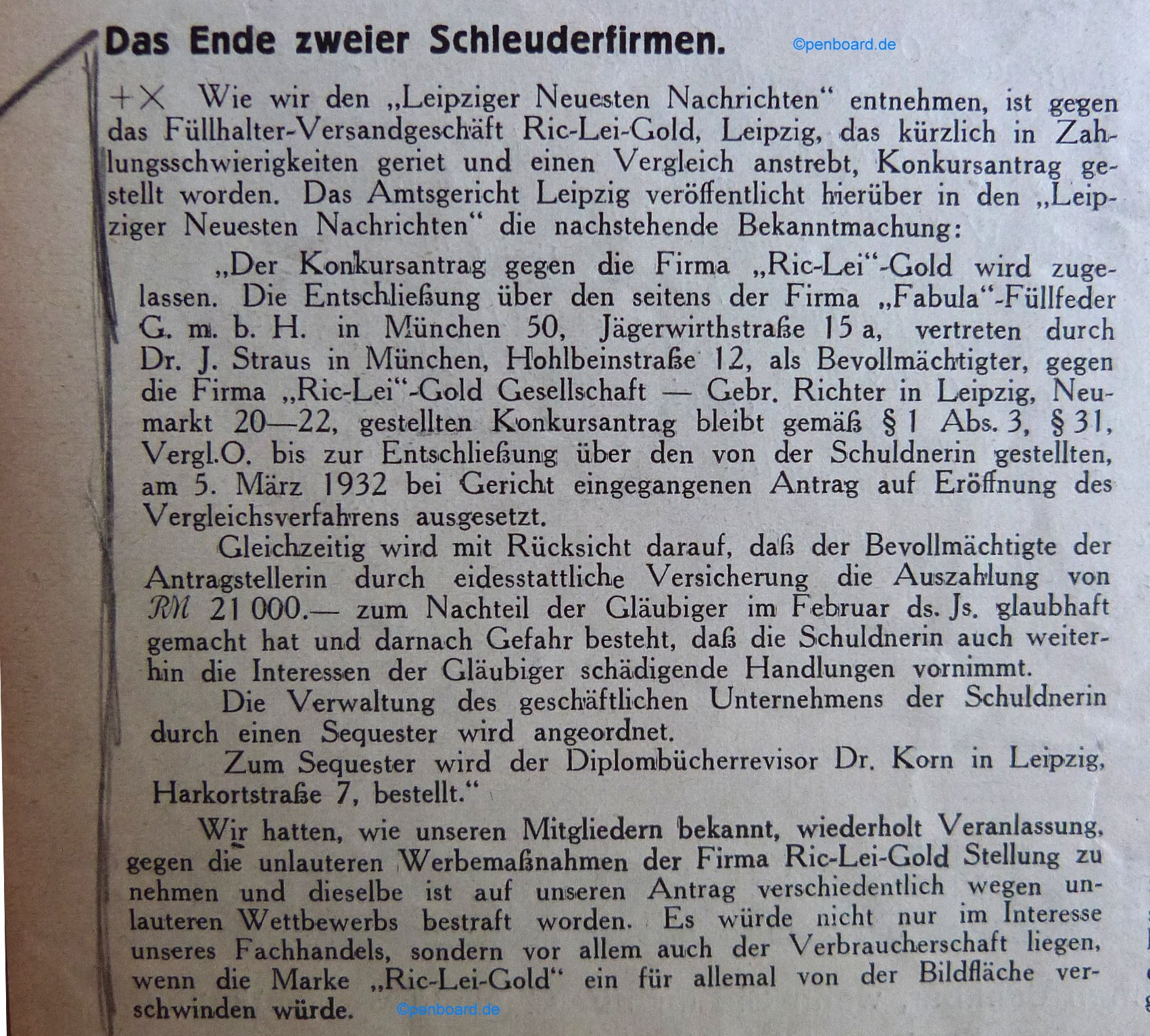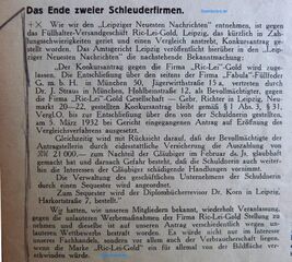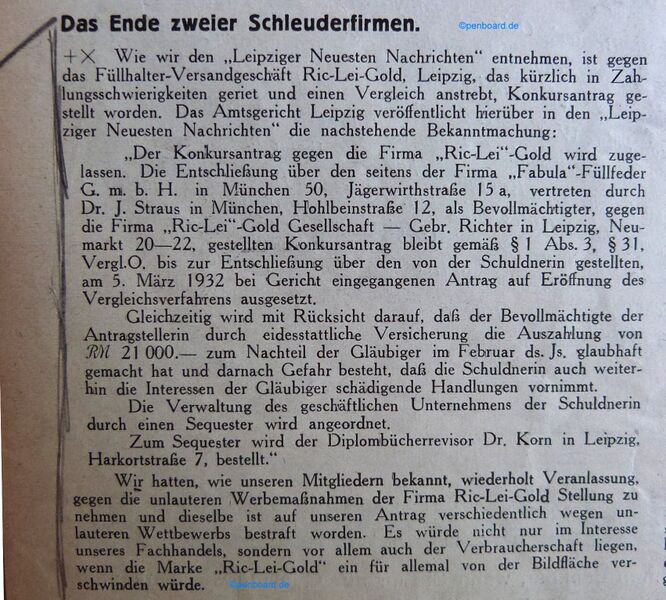 Scansione di un articolo datata 1932. Pubblicazione su: Der Papierhändler - Fachblatt Schreibwaren für Papier u. Büro-Bedarf. Contributo di Tom Westerich, https://www.penboard.de. Data ottenuta da quella di pubblicazione del volume da cui la pagina è estratta. Articolo contro la ditta "Ric-Lei-Gold Gesellschaft, Gebr. Richter", Leipzig che ne riporta l'istanza di fallimento.