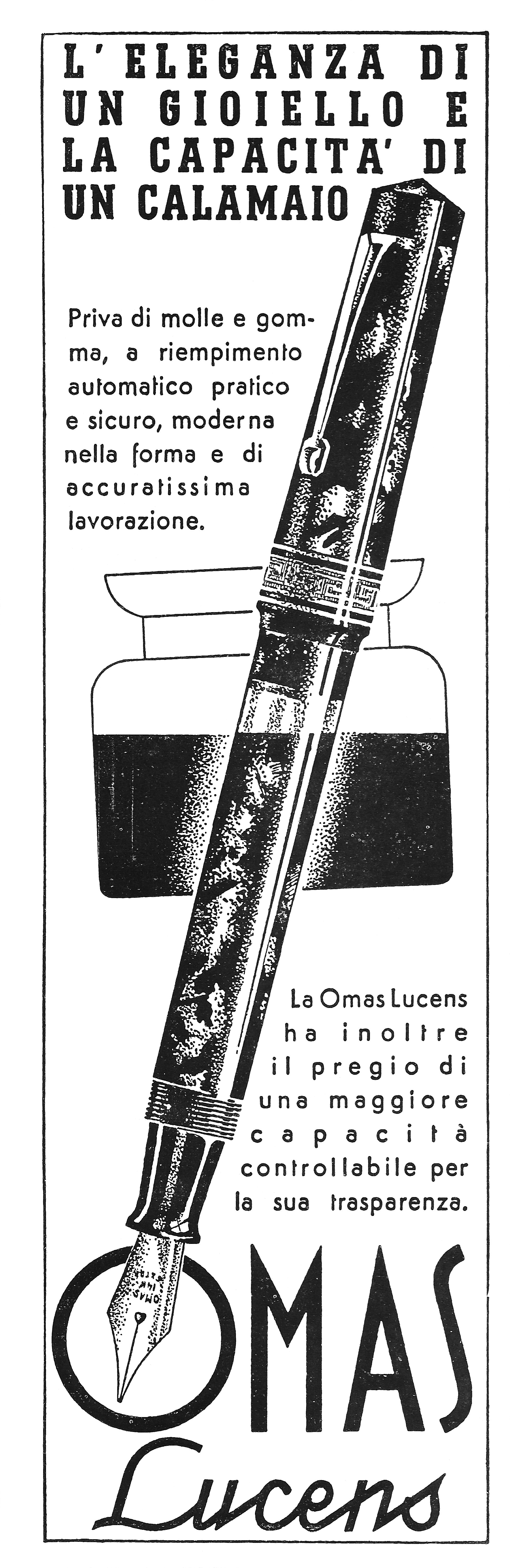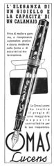 Scansione di una pubblicità Omas datata 1936-11-01. Pubblicazione su: L'Illustrazione Italiana, anno LXIII, n. 44, pag. XVI (pubblicità). Usa lo slogan: "L'eleganza di un gioiello e la capacità di un calamaio". Ritoccata dall'autore per una migliore nitidezza. Data ottenuta da quella di pubblicazione del volume da cui la pagina è estratta. Pubblicata anche (in due varianti) su: N. 47 (1936-11-22), N. 49 (1936-12-06), N. 51 (1936-12-20), N. 52 (1936-12-27); anno LXIV, N. 6 (1937-02-07), N. 12 (1937-03-21), N. 19 (1937-05-09), N. 28 (1937-07-11), N. 35 (1937-08-29), N. 40 (1937-10-03), N. 47 (1937-11-21); anno LXV, N. 1 (1938-01-02), N. 9 (1938-02-27), N. 17 (1938-04-24), N. 21 (1938-05-22), N. 29 (1938-07-17), N. 37 (1938-09-11), N. 46 (1938-11-13); anno LXVI, N. 1 (1939-01-01), N. 9 (1939-02-26), N. 16 (1939-04-16), N. 24 (1939-06-11), N. 32 (1939-08-06), N. 40 (1939-10-01), N. 48 (1939-11-26). Pubblicizza il modello Lucens.