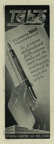 Scansione di una pubblicità Tabo (un marchio della Stiassi e Tantini) datata 1942-11-29. Pubblicazione su: L'Illustrazione Italiana, anno LXIX, n. 48. Ritoccata dall'autore per una migliore nitidezza. Data dal reperimento della pagina su una versione archiviata della rivista. Pubblicata anche su: N. 51 (1942-12-20), N. 52 (1942-12-27); anno LXX, N. 1 (1943-01-03), N. 2 (1943-01-10), N. 3 (1943-01-17), N. 4 (1943-01-24), N. 5 (1943-01-31), N. 6 (1943-03-07), N. 7 (1943-03-14). Pubblicizza il modello Trasparente.