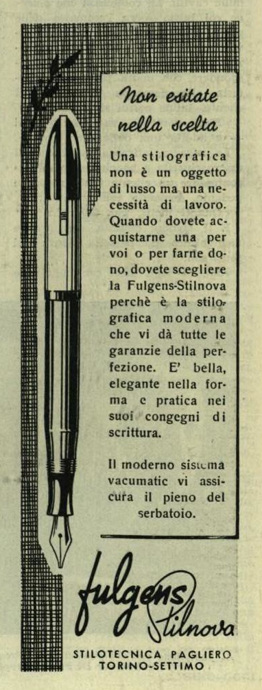 Scanning of advertising from Pagliero dated 1946-09-29. Published on: L'Illustrazione Italiana, year Nuova Serie, n. 39. Dating established by finding the page in an archived version of the magazine. Pubblished also on: N. 48 (1946-12-01). Advertising for the Fulgens Stilnova model.
