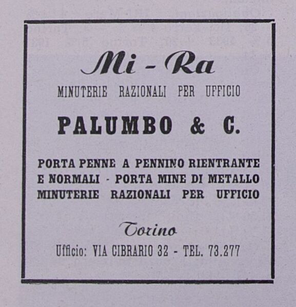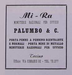 Scanning of advertising from Mi-Ra dated 1949-04-05. Published on: Cronache Economiche, n. 55-56, pag. 57. Published by "Camera di Commercio Industria e Agricoltura di Torino". Refers to the company as: "Mi-Ra minuterie razionali per ufficio Palumbo & C.". Mention as address: "Torino - Via Cibrario 32". Dating established by finding the page in an archived version of the magazine. Generic advertising: reports production of retractable and normal dip nib holders, metal pencil holders, mechanical pencils and office accessories. Headquarters on same street of Stilus but does not seems to be any relation. Published also on: N. 57 (1949-05-05) p. 29, N. 58 (1949-05-20) p. 21, N. 59 (1949-06-05) p. 26, N. 60 (1949-06-20) p. 69, N. 61 (1949-07-05) p. 32, N. 62 (1949-07-20) p. 15, N. 63 (1949-08-05) p. 39.