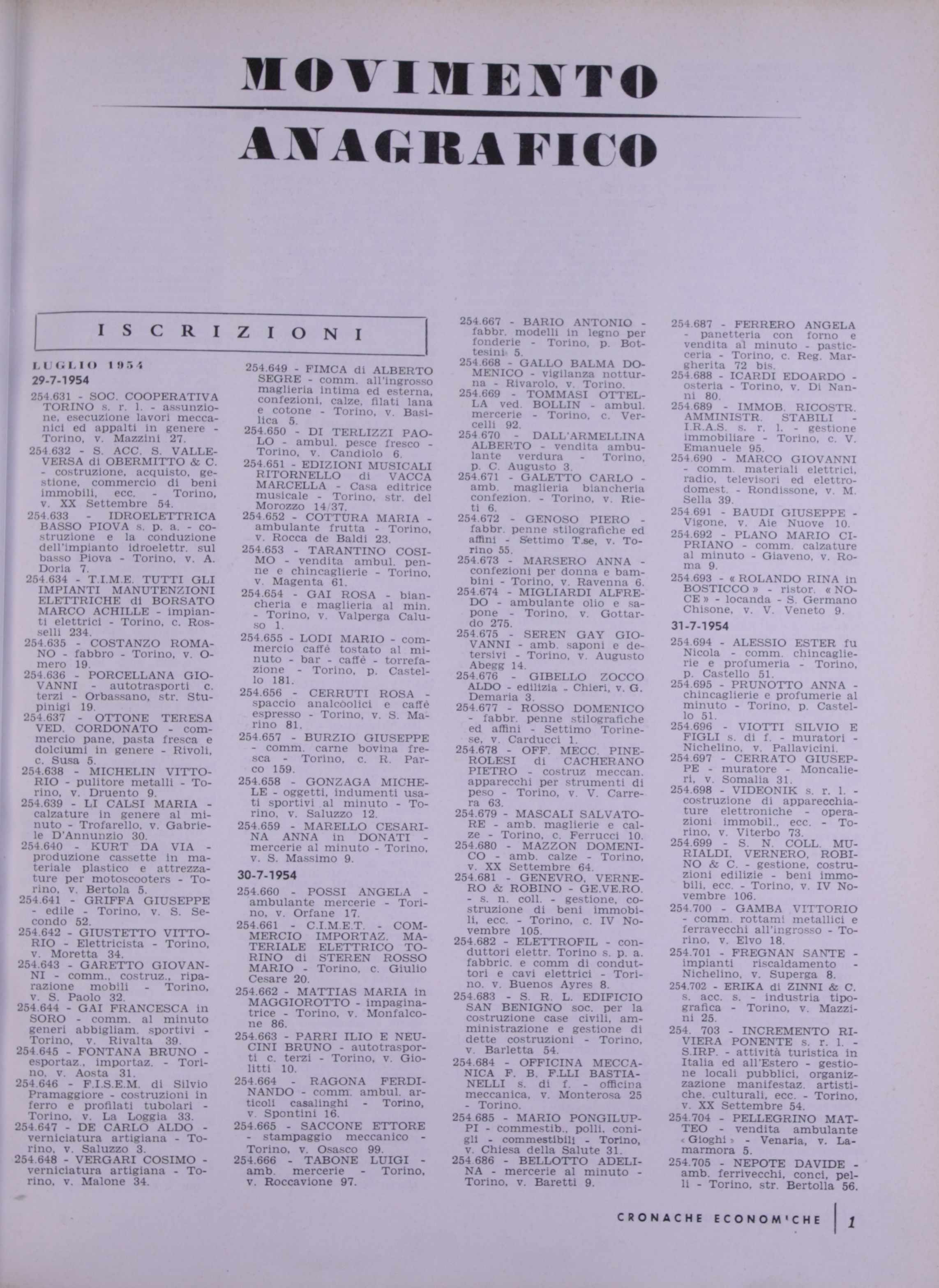 Scansione di un periodico del 1954-09. Tratta da: "Cronache Economiche", volume 141, (pag. 1), edito da "Camera di Commercio Industria e Agricoltura di Torino". Concerne le aziende: Genoso & Rosso. Pagina della sezione "Movimento anagrafico", luglio 1954, sottosezione "Iscrizioni". Riporta in data 1954-07-30 al n. 254.672: "GENOSO PIERO" per "fabbr. penne stilografiche ed affini", Settimo Torinese, via Torino 55; al n. 254.677: "ROSSO DOMENICO" per "fabbr. penne stilografiche ed affini", Settimo Torinese, via Carducci 1.