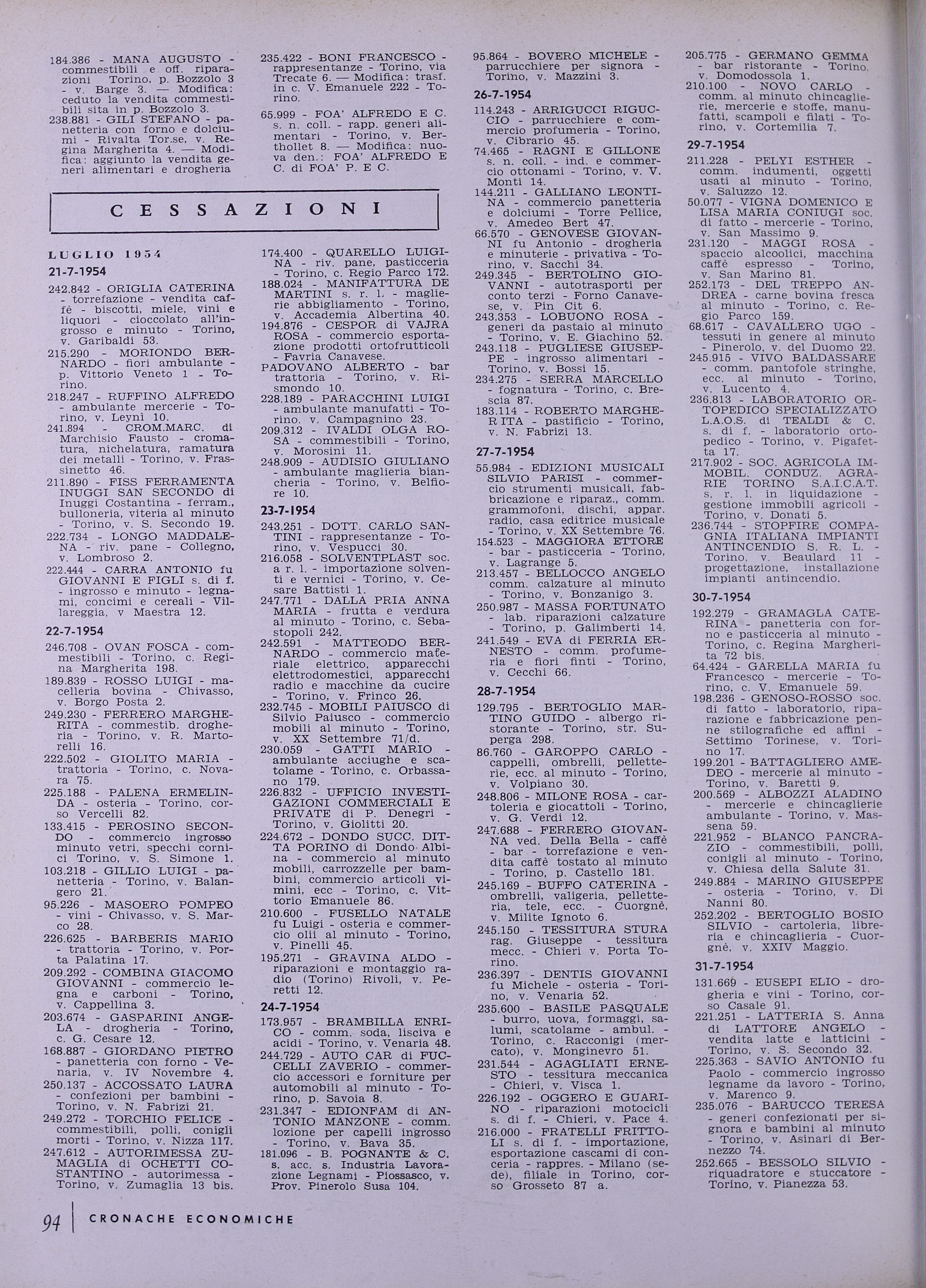 A page scanned from a magazine dated 1954-09. Extract from: "Cronache Economiche", vol. 141, (pag. 94), published by "Camera di Commercio Industria e Agricoltura di Torino". Concerning companies: Genoso & Rosso. Page of "Registry Movement" section, July 1954, "Terminations" subsection. Reports on 1954-07-30 at n. 198.236: "GENOSO-ROSSO soc. di fatto" for "laboratorio, riparazione e fabbricazione penne stilografiche ed affini", Settimo Torinese, via Torino 17.