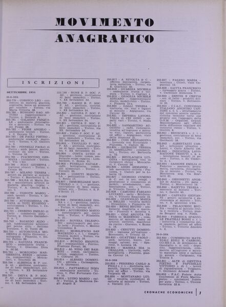 Scansione di un periodico del 1954-11. Tratta da: "Cronache Economiche", volume 143, (pag. 1), edito da "Camera di Commercio Industria e Agricoltura di Torino". Pagina della sezione "Movimento anagrafico", settembre 1954, sottosezione "Iscrizioni". Riporta in data 1954-09-25 al n. 255.784: "PINNELLI PAOLO di Pietro" come "amb. penne, matite, occhiali da sole", Torino, corso Verona 1. Riporta al n. 255.792: "BAIARDO ALDO" per "lab. fabbricazione accessori per penne stilo", Settimo Torinese, via G. Verdi 29.