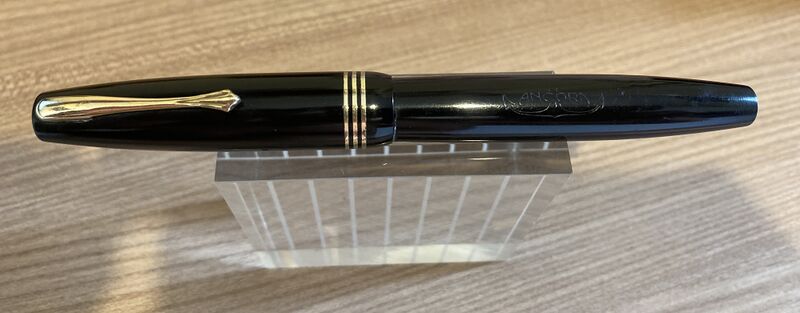 Photo of a pen produced by Ancora. Filling system: lever filler. In black celluloid. Low tier model from WWII period. Big size (14,4 cm).