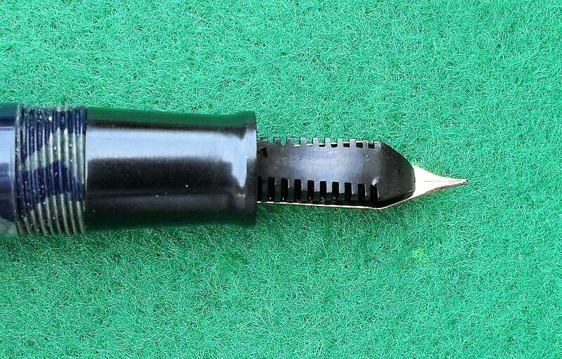 Photo of a pen produced by Ancora. Filling system: lever filler. In marbled gray celluloid. Detail of feeder. Low tier model from WWII period. Medium size.