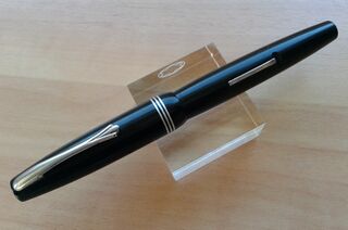 Photo of a pen produced by Ancora. Filling system: lever filler. In black celluloid. Low tier model from WWII period. Medium size.