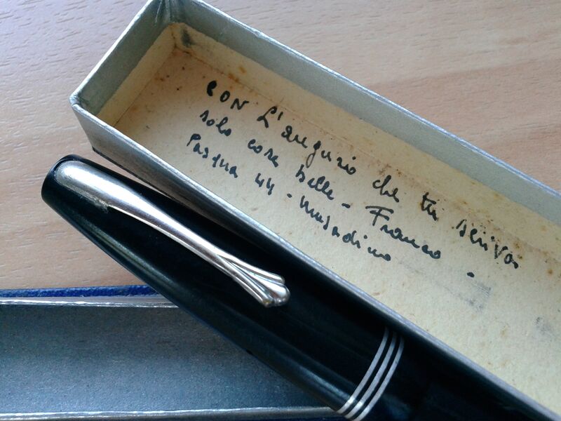 Photo of a pen produced by Ancora. Filling system: lever filler. In black celluloid. Low tier model from WWII period. Medium size.