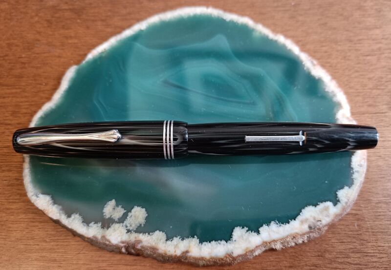 Photo of a pen produced by Ancora. Filling system: lever filler. In striated gray celluloid. Low tier model from WWII period.