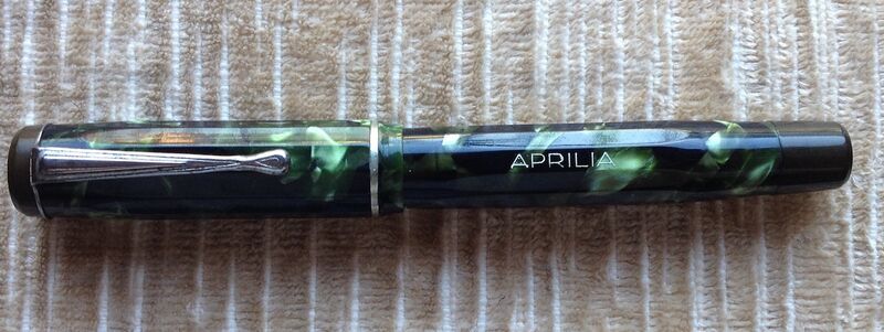 Foto di una penna Aprilia. Caricamento a pulsante di fondo. Realizzazione in celluloide marmorizzata verde. Modello ignoto. Contributo di Paolo (utente forum PG1964TO).