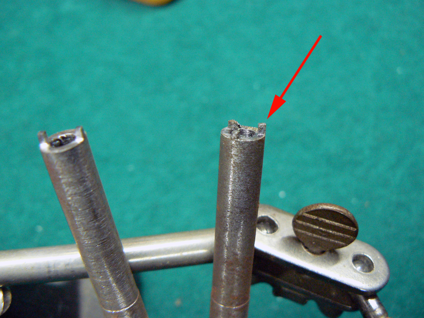 Due chiavi per lo smontaggio del dado interno che blocca la vite di fissaggio per il fermaglio ed il controcappuccio di una Aurora 88, per le due varianti note: con due tacche a 180° e tre tacche a 120°. Si noti come nel caso della chiave per la variante a tre tacche un dentino (mostrato dalla freccia) sia più lungo.