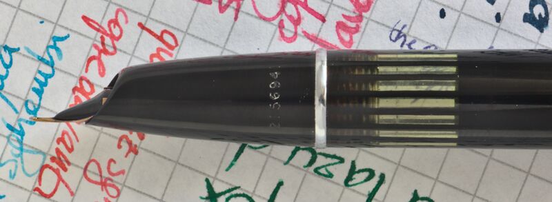 Foto di una penna Aurora. Modello: Aurora 88K. Caricamento a stantuffo. Realizzazione in celluloide nera. Dettaglio del pennino. Dettaglio dell'alimentatore. Versione con cappuccio cromato e testina a vite nera. Seriale 2156941.