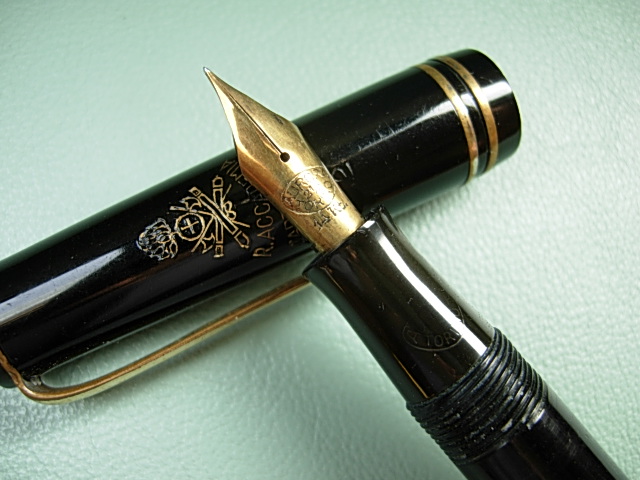 Foto di una penna Aurora. Caricamento a levetta di fondo. Realizzazione in celluloide nera. Modello realizzato per la "Regia Accademia D'Artiglieria e Genio", probabilmente destinati agli ufficiali della scuola. Contributo di Paolo, http://www.zona900.it, (utente forum fountainpen.it sanpei).
