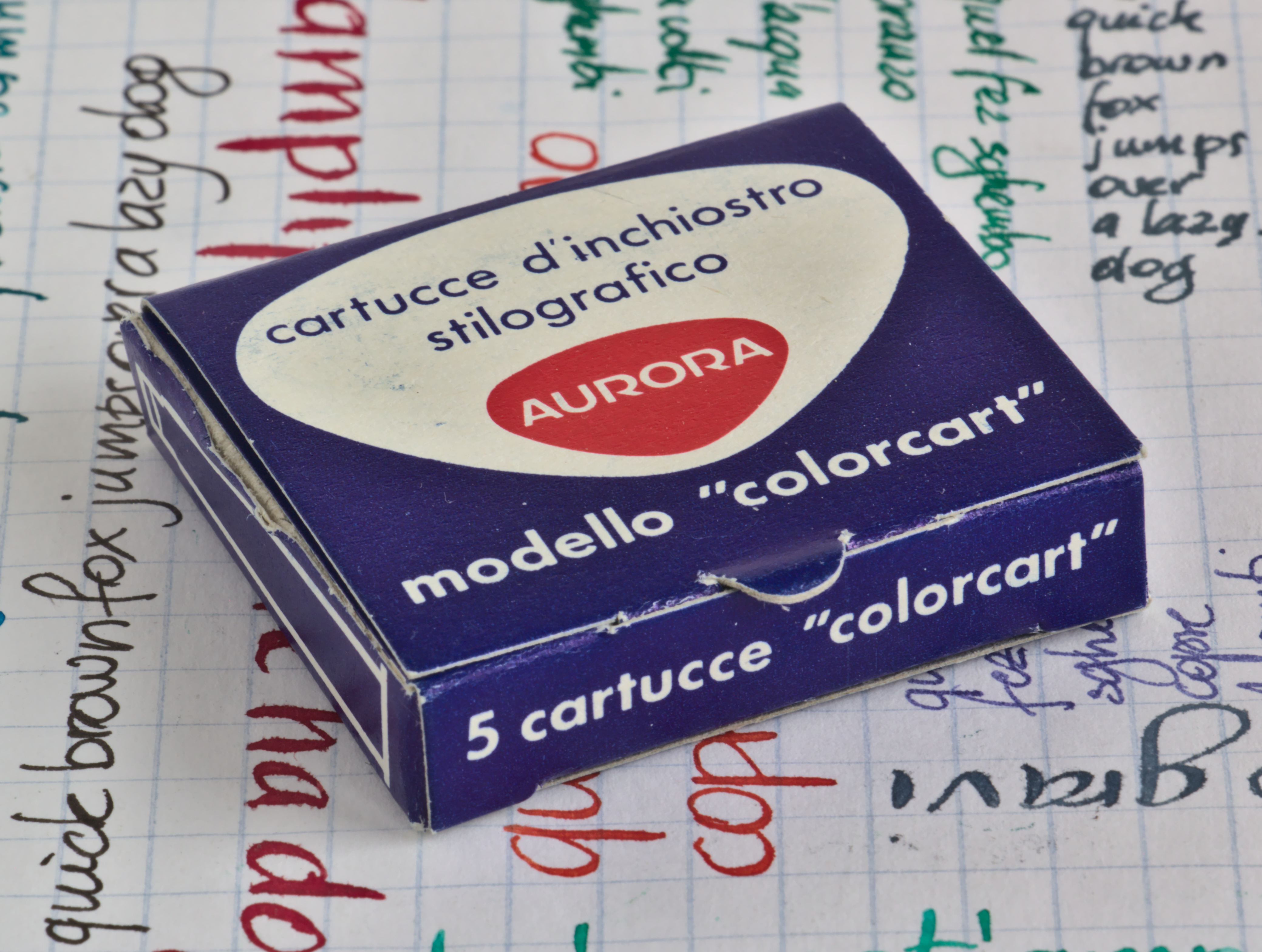 Foto di una scatola di cartucce Aurora. Scatola da 5 cartucce Colorcart.