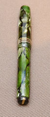 Photo of a pen produced by Aurora. Model: Novum. Filling system: back lever. In marbled green celluloid. Lady version, first version, faceted.