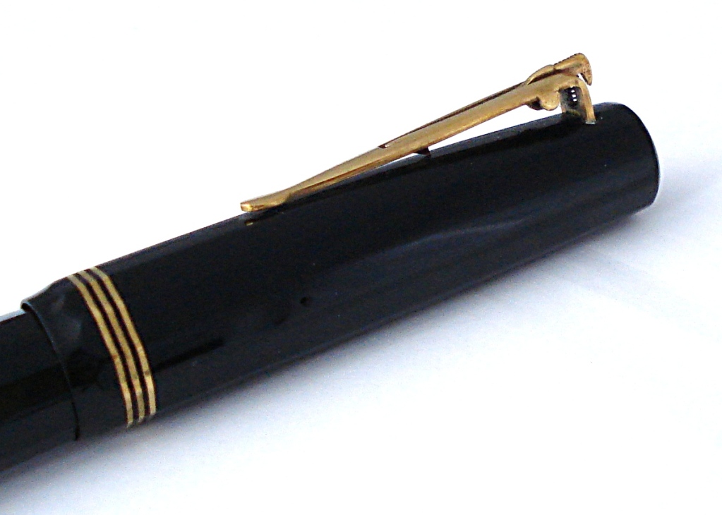 Foto di una penna Aurora. Modello: Novum. Caricamento a levetta di fondo. Realizzazione in celluloide nera. Dettaglio del cappuccio. Misura media, prima serie, faccettata. Contributo di Fabio (utente forum fountainpen.it fabbale09).