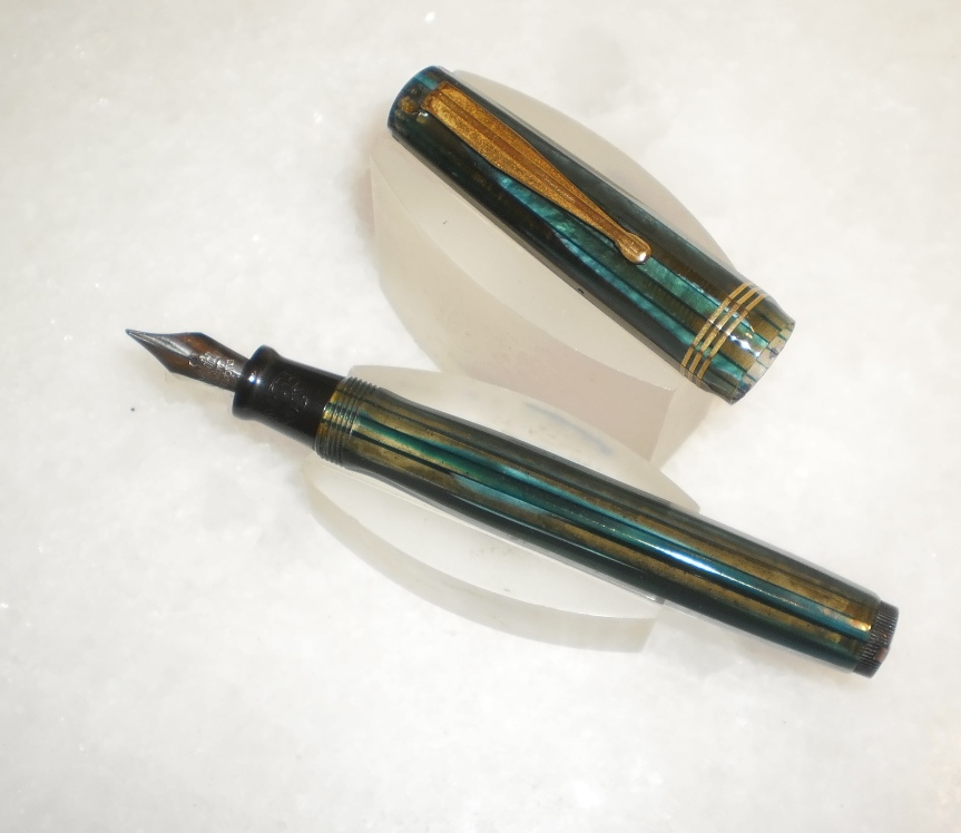 Photo of a pen produced by Aurora. Model: Novum. Filling system: back lever. In azure striped celluloid. Medium size, first version, faceted.