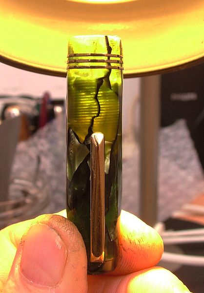 Foto di una penna Aurora. Modello: Novum. Caricamento a levetta di fondo. Realizzazione in celluloide marmorizzata verde. Dettaglio del cappuccio. Misura grande, seconda serie, sfaccettata. Contributo di Massimo (utente forum maxpop55).